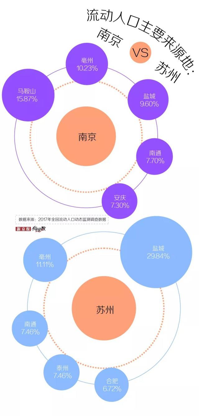 根據(jù) 2017 年全國(guó)流動(dòng)人口動(dòng)態(tài)監(jiān)測(cè)調(diào)查數(shù)據(jù),南京流動(dòng)人口的第一來(lái)源地是馬鞍山,前五大來(lái)源地中有三個(gè)是安徽的城市;蘇州流動(dòng)人口的第一來(lái)源地是鹽城,前五大來(lái)源地本省占了三個(gè)。