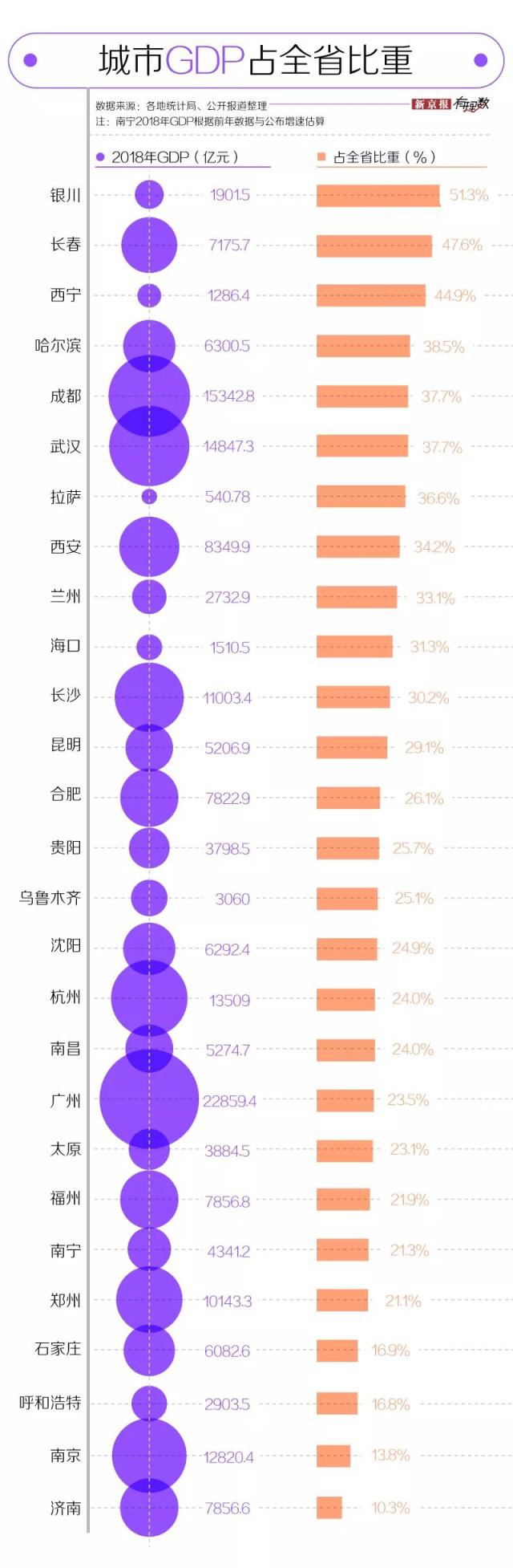 我們梳理了 27 個(gè)省和自治區(qū) 2018 年的地區(qū)生產(chǎn)總值后發(fā)現(xiàn),目前西藏、青海、寧夏、海南、甘肅五地 GDP 未破萬(wàn)億,所以相應(yīng)的拉薩、西寧、銀川、??凇⑻m州留給大家的記憶點(diǎn)可能不多;而像江蘇、山東兩地 GDP 可以排在全國(guó)前十,但其省會(huì)城市南京、濟(jì)南的 GDP 占全省比重不到 15%。