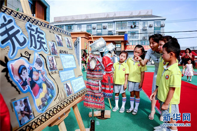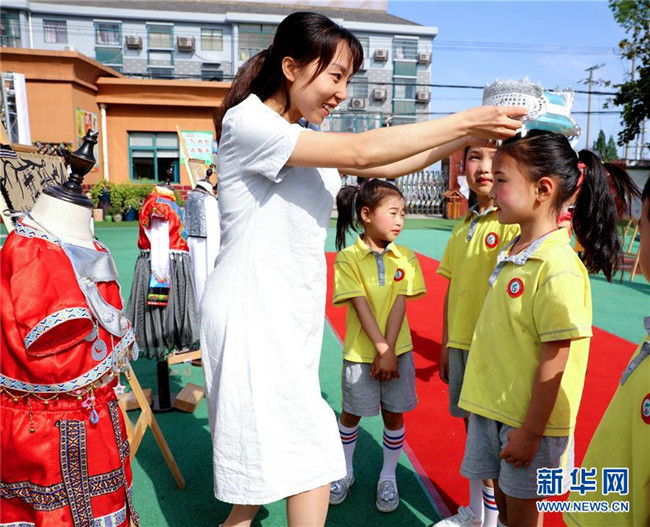 5月28日,家長和孩子們在展示不同民族的服飾。