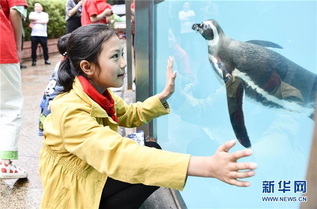5月29日,在重慶市動(dòng)物園內(nèi)的互動(dòng)區(qū),蓼子鄉(xiāng)第一中心小學(xué)的馬嬌陽(yáng)在觀賞企鵝。新華社記者 劉潺 攝