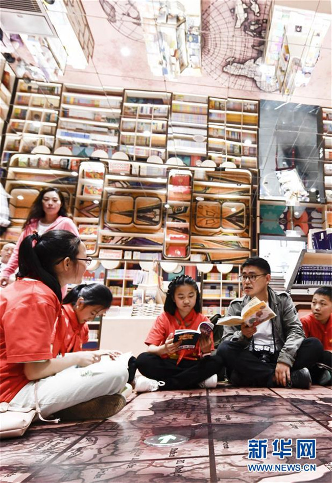 5月29日,在重慶市九龍坡區(qū)一家書(shū)店內(nèi),重慶鐵路小學(xué)的老師鄧賢莎(右二)和蓼子鄉(xiāng)第一中心小學(xué)的學(xué)生一起讀書(shū)。新華社記者 劉潺 攝