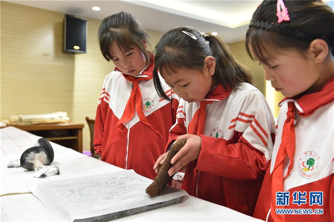 5月31日,學(xué)生們在寧夏固原博物館體驗(yàn)拓印。新華社記者 唐亞蒙 攝