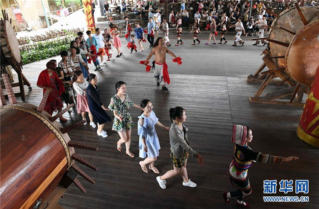 游客與基諾族大鼓舞演員一起跳舞(6月1日攝)。
