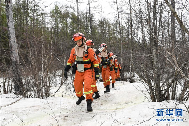 奇乾中隊(duì)消防隊(duì)員在戶外進(jìn)行綜合訓(xùn)練時(shí)經(jīng)過一片暫未消融的冰雪(5月19日攝)。新華社記者 劉磊 攝