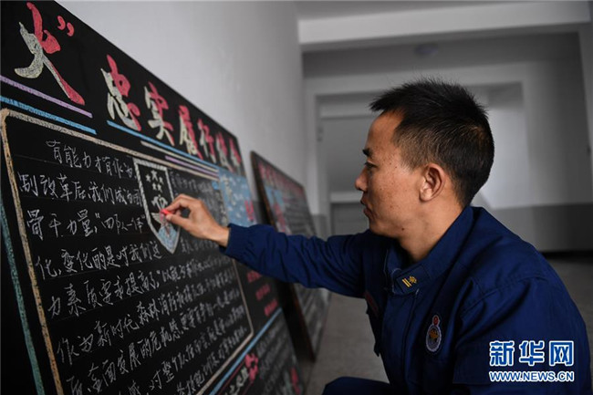 在奇乾中隊(duì)的營地,來自四川大涼山的彝族小伙兒布約小兵用粉筆修飾黑板報(bào)(5月18日攝)。新華社記者 劉磊 攝