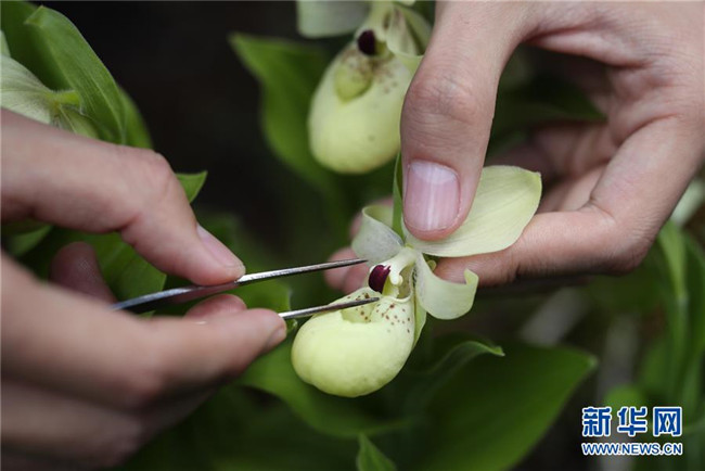 6月12日,在四川黃龍管理局花卉培育基地,四川黃龍自然保護(hù)區(qū)的高級顧問干文清在給人工保育的杓蘭標(biāo)注標(biāo)識。 新華社記者江宏景攝