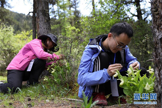 6月12日,在四川黃龍自然保護(hù)區(qū)黃龍溝,來自北京植物園的研究員徐可(右)和王濤在給黃花杓蘭進(jìn)行異花授粉。新華社記者江宏景攝