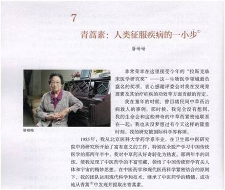 據(jù)悉,今年秋季學(xué)期將開始推廣的統(tǒng)編高中語文教材已確定將屠呦呦2011年的獲獎(jiǎng)感言及同年發(fā)表的論文改編成課文《青蒿素:人類征服疾病的一小步》。人民教育出版社有關(guān)負(fù)責(zé)人介紹,屠呦呦在青年時(shí)期培養(yǎng)了對傳統(tǒng)醫(yī)藥學(xué)的熱愛,歷經(jīng)數(shù)年終于從古代藥典中獲得靈感,發(fā)現(xiàn)了青蒿素,并且至今仍在科學(xué)探索道路上孜孜以求。此次選錄這篇文章,旨在引導(dǎo)學(xué)生了解和尊重科學(xué),從屠呦呦的科研歷程中汲取力量。