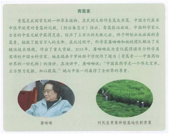 此外,初中歷史教材也在《中國歷史》八年級下冊第18課“科技文化成就”中,對屠呦呦科研團(tuán)隊(duì)先進(jìn)事跡進(jìn)行了專題介紹。