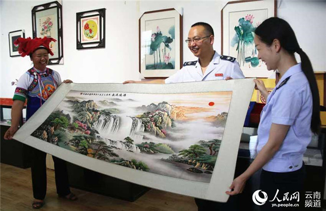 沉下心來學習刺繡的王陸芬朝著自己的小目標努力。白天,她向村里的老人們學習刺繡技法,學習構(gòu)圖、畫圖,晚上就在家里刻苦練習。一有機會,王陸芬就出去考察學習。“有一年去上??疾?,看到他們的刺繡還沒有我做的精細,沒想到價格還很貴。”這讓王陸芬堅定了自己的想法,在王陸芬的帶動下,白沙坡村成立了刺繡協(xié)會,協(xié)會一開始只有26人。2014年2月,技藝日臻成熟的王陸芬成立了“紙藝刺繡農(nóng)民專業(yè)合作社”,2015年成立硯山縣華韻手工刺繡有限公司。