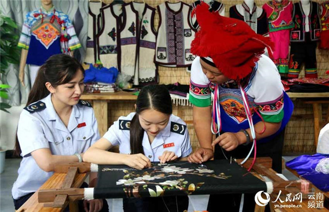 6月18日,恰逢硯山縣稅務局上門服務,王陸芬教稅務人員刺繡。攝影:陸安恒
