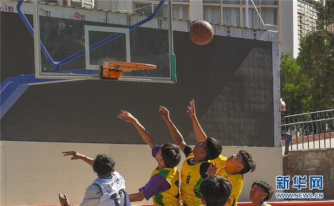 鹽井中學(xué)的學(xué)生們在體育課上打籃球(6月6日攝)。年輕的藏族女教師坐在鋼琴前,手指靈動地彈奏樂曲,兩名學(xué)生拉起弦子伴奏,三十多名學(xué)生站成四排,齊聲合唱。學(xué)校籃球場上數(shù)名身材高大的學(xué)生,正在體育老師的組織下進(jìn)行激烈的分組對抗,不一會兒,學(xué)生們個個汗流浹背。綜合樓三樓的化學(xué)實(shí)驗(yàn)室內(nèi),身穿白色大褂的學(xué)生,分成若干小組,正在做簡單的化學(xué)實(shí)驗(yàn)。這一幕幕,同時出現(xiàn)在西藏昌都市芒康縣鹽井中學(xué)。新華社記者晉美多吉攝