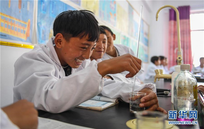 鹽井中學(xué)的學(xué)生們在上化學(xué)課(6月6日攝)。年輕的藏族女教師坐在鋼琴前,手指靈動地彈奏樂曲,兩名學(xué)生拉起弦子伴奏,三十多名學(xué)生站成四排,齊聲合唱。學(xué)校籃球場上數(shù)名身材高大的學(xué)生,正在體育老師的組織下進(jìn)行激烈的分組對抗,不一會兒,學(xué)生們個個汗流浹背。綜合樓三樓的化學(xué)實(shí)驗(yàn)室內(nèi),身穿白色大褂的學(xué)生,分成若干小組,正在做簡單的化學(xué)實(shí)驗(yàn)。這一幕幕,同時出現(xiàn)在西藏昌都市芒康縣鹽井中學(xué)。新華社記者晉美多吉攝