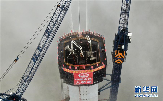 當(dāng)日,滬通長江大橋南主塔順利封頂。至此,該橋兩座高達(dá)330米的主塔全部建成,標(biāo)志著世界最大跨度公鐵兩用斜拉橋建設(shè)取得了關(guān)鍵性進(jìn)展。滬通長江大橋全長11072米,主橋長2296米,主跨1092米,是滬通鐵路全線的控制性工程,設(shè)計(jì)為上層6車道高速公路,下層4線鐵路。新華社發(fā)(許叢軍攝)