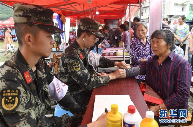 在四川長寧地震災(zāi)區(qū)安置點,武警宜賓支隊衛(wèi)生隊黨小組成員為群眾提供醫(yī)療服務(wù)(6月20日攝)。新華社記者 劉坤 攝