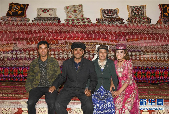 這是大同鄉(xiāng)阿依克日克村二小隊村民瑪達孜孜·由力達西(左二)一家在安居房內(nèi)的合影(6月17日攝)。新華社記者胡虎虎攝
