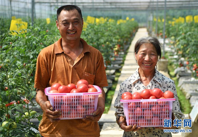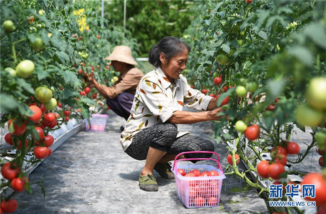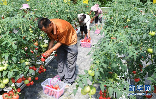 7月2日,馬灌鎮(zhèn)果園村村民在無土栽培西紅柿大棚內采摘。新華社記者 王全超 攝