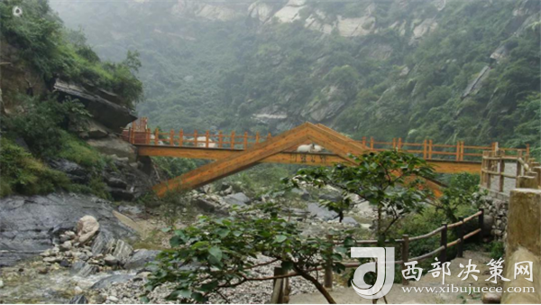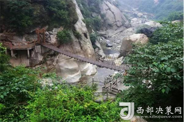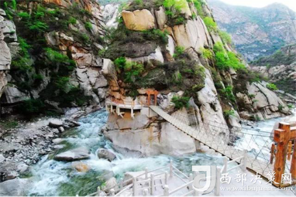 踏進(jìn)峪口,頭頂是遮天蔽日的綠色,四周水聲潺潺,鳥鳴悅耳,空谷幽靈,沉靜自然,涼爽的山風(fēng)夾雜著花草的芳香,瞬間就滋潤(rùn)了燥熱的心情。迎著溪谷逆水而上,山的奇特與水的靈秀交織在一起,伴著水聲,綿延著向更遠(yuǎn)處伸展。若有情致,卷起褲腿,或穿上沙灘鞋,或赤足,踏著被溪水長(zhǎng)久沖刷平整光滑的大石頭,任由清涼通透的溪水撫摸雙足,沁心入骨,仿佛拾回了童年的歡樂(lè),煩擾憂愁全無(wú)蹤影。臨水而筑的棧道,全程依水而行,曲徑通幽,每轉(zhuǎn)一道彎,都是一幅新景。