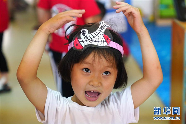 7月4日,小朋友在游戲中頭戴分類(lèi)垃圾的圖案。新華社記者 張宏祥 攝