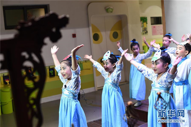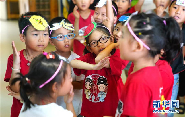 7月4日,德清縣乾元鎮(zhèn)第一幼兒園小朋友們?cè)诔诸?lèi)兒歌。新華社記者 郭緒雷 攝
