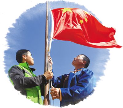 阿迪亞和兒子在升國旗。本報記者 吳 勇攝