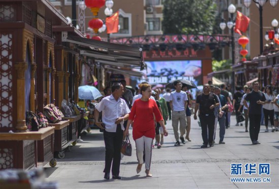 游客在新疆國(guó)際大巴扎景區(qū)步行街游覽(7月13日攝)。