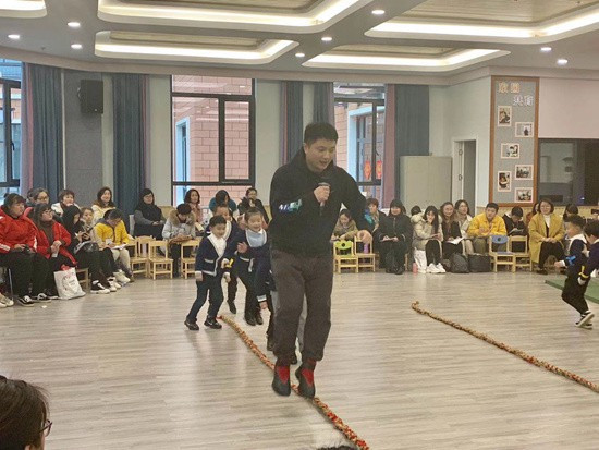 1月10日,浙江省建德市航頭中心幼兒園教師鄭文聰在進(jìn)行幼兒園大班健康活動(dòng)《稻繩爬爬樂》。鄭文聰供圖
