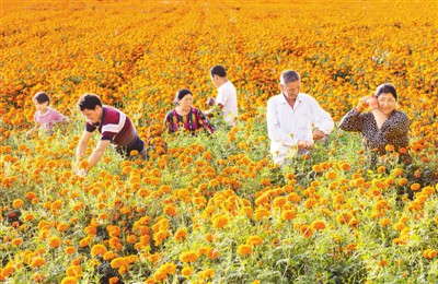 近年來,新疆維吾爾自治區(qū)的莎車晨光生物公司通過“公司+基地+合作社+農(nóng)戶”的形式帶動農(nóng)民大面積種植萬壽菊,7年來累計(jì)帶動農(nóng)民增收6億多元,實(shí)現(xiàn)出口創(chuàng)匯4357萬美元,繳納稅金1200多萬元,使5萬多貧困戶擺脫了貧困。圖為7月18日,莎車縣的維族群眾正在采摘被他們譽(yù)為“致富花”的萬壽菊。本報記者史家民攝
