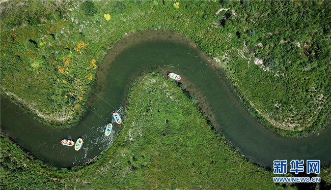 7月21日,游客在承德縣柳河十八灣花海漂游景區(qū)體驗(yàn)漂流(無人機(jī)拍攝)。