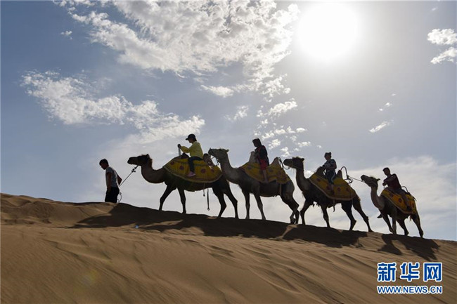 游客在新疆鄯善縣庫(kù)木塔格沙漠風(fēng)景區(qū)體驗(yàn)騎駱駝(7月2日攝)。