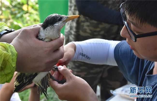 7月25日,美國鳥類保護專家在浙江韭山列島國家級自然保護區(qū)為一只鳳頭燕鷗幼鳥戴上標志。新華社記者 殷曉圣 攝