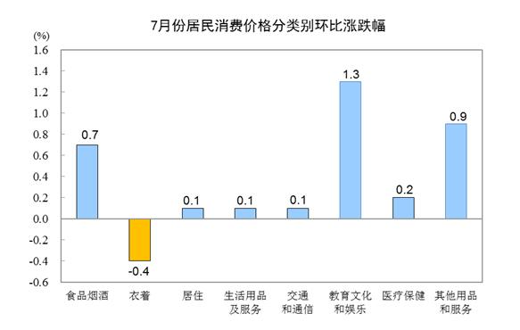 7月份,全國居民消費價格環(huán)比上漲0.4%。其中,城市上漲0.4%,農(nóng)村上漲0.3%;食品價格上漲0.9%,非食品價格上漲0.3%;消費品價格上漲0.2%,服務(wù)價格上漲0.7%。