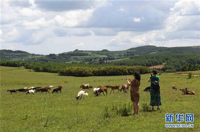 8月10日,游人在云南尋甸北大營草場拍照。 新華社記者楊宗友攝