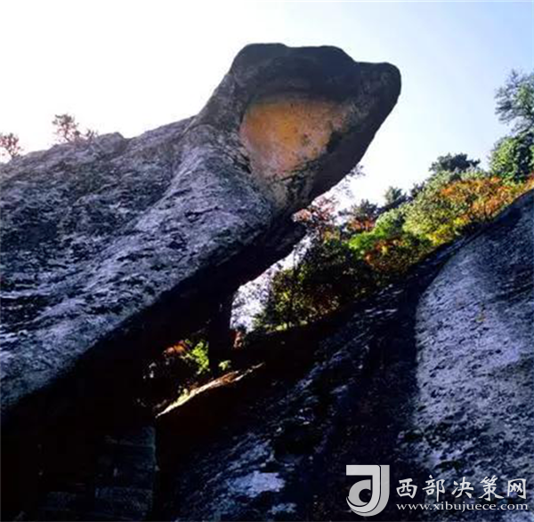 峰南側(cè)是千丈絕壁,直立如削,下臨一斷層深壑,同三公山、三鳳山隔絕。南峰由一峰二頂組成,東側(cè)一頂叫松檜峰,西側(cè)一頂叫落雁峰,也有說南峰由三頂組成,把落雁峰之西的孝子峰也算在其內(nèi)。這樣一來,落雁峰最高居中,松檜峰居?xùn)|,孝子峰居西,整體形象一把圈椅,三個(gè)峰頂恰似一尊面北而坐的巨人。