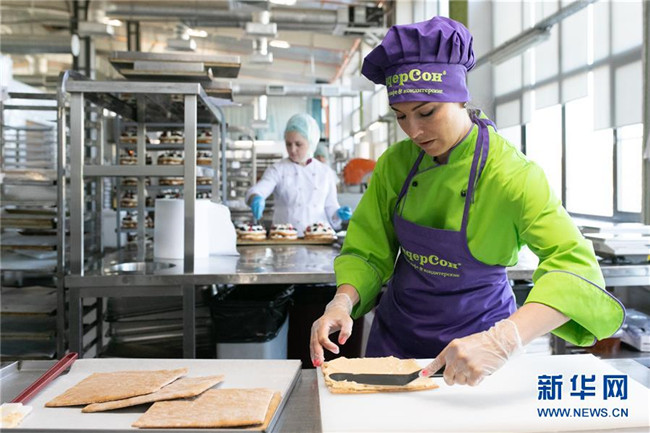 8月28日,在俄羅斯首都莫斯科,糕點(diǎn)師尤利婭將打發(fā)的奶油抹平。 新華社記者 白雪騏 攝