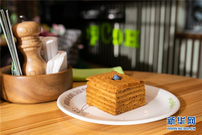 這是8月28日在俄羅斯首都莫斯科的一家咖啡廳內(nèi)拍攝的俄式蜂蜜蛋糕。 新華社記者 白雪騏 攝