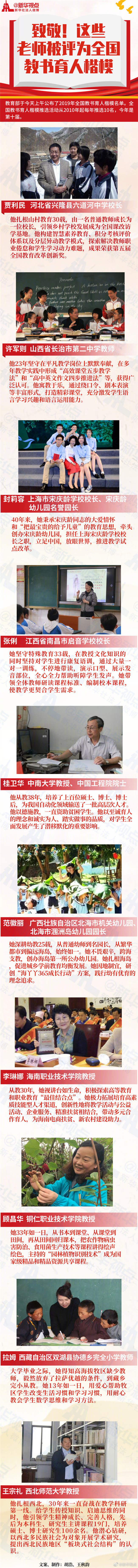 教育部教師工作司司長任友群介紹,全國教書育人楷模推選活動,今年是第10屆,每年推出10位。今年的10名獲獎?wù)咧校薪處?人、女教師6人;年齡最大69歲、最小33歲;鄉(xiāng)村教師2人、少數(shù)民族3人。具體名單包括:河北省興隆縣六道河中學(xué)賈利民、山西省長治市第二中學(xué)許軍則、上海宋慶齡學(xué)校封莉容、江西省南昌市啟音學(xué)校張俐、中南大學(xué)桂衛(wèi)華、廣西北海市潿洲島幼兒園范徽麗、海南職業(yè)技術(shù)學(xué)院李琳娜、銅仁職業(yè)技術(shù)學(xué)院顧昌華、西藏自治區(qū)雙湖縣協(xié)德鄉(xiāng)完全小學(xué)拉姆、西北師范大學(xué)王宗禮。