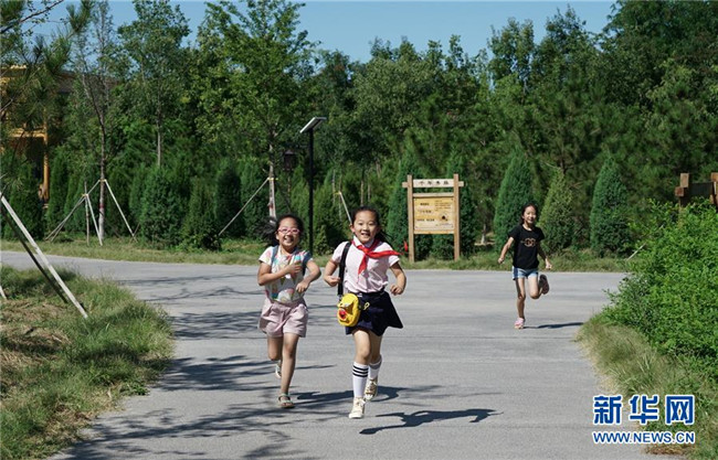 小學(xué)生們在千年秀林內(nèi)玩耍(8月29日攝)。新華社記者 牟宇 攝