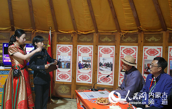 牧民布和(上圖右二)在當(dāng)?shù)馗虏榉▌?wù)室通過(guò)4K機(jī)頂盒智能服務(wù)終端,向律師咨詢(xún)法律問(wèn)題。