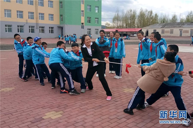 鄉(xiāng)村教師袁艷敏和學(xué)生一起拔河(2018年5月8日攝)。新華社發(fā)