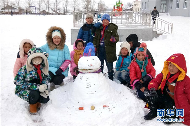 鄉(xiāng)村教師袁艷敏(左后二)和學(xué)生一起堆雪人(2017年12月12日攝)。新華社發(fā)