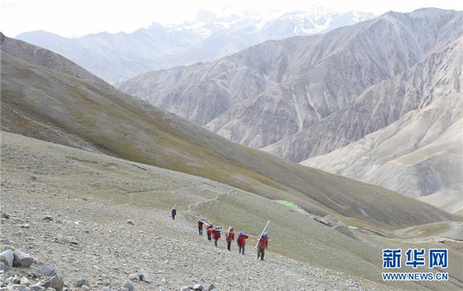 工人在喀喇昆侖山脈上為馬爾洋鄉(xiāng)輸電工程運(yùn)送鋼管(9月7日攝)。 新華社記者 杜剛 攝
