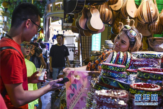 在位于烏魯木齊的大巴扎景區(qū),游客在觀光購物(8月8日攝)。 新華社記者 王菲 攝