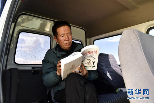 9月25日,青海湖國家級自然保護(hù)區(qū)管理局的巡湖觀測人員王延明在巡湖間隙閱讀中國鳥類野外手冊。