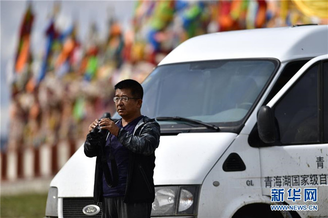 9月24日,青海湖國家級自然保護(hù)區(qū)管理局的巡湖觀測人員王延明在青海湖畔進(jìn)行觀測。