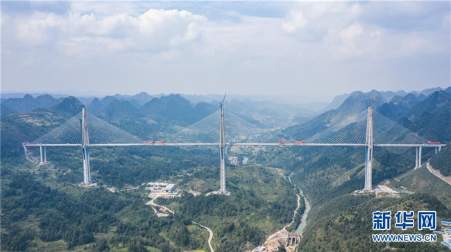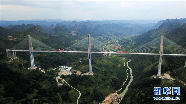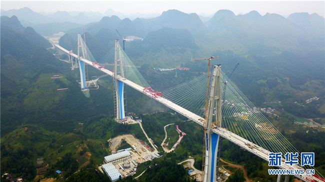 當(dāng)日,332米高的全球最高混凝土橋塔——貴州平塘至羅甸高速公路控制性工程平塘特大橋成功合龍。記者從貴州省交通運(yùn)輸廳了解到,平塘特大橋全長2135米,橋面寬30.2米,規(guī)劃雙向4車道,是一座三塔雙索面疊合梁斜拉橋。三座橋塔的高度分別為320米、332米和298米,相當(dāng)于在峽谷之中建了三座100多層高的大樓。平塘特大橋于2016年4月開工建設(shè),2018年11月橋塔順利封頂,計(jì)劃總工期為42個月,總投資15億元。此次合龍后,還要進(jìn)行橋面施工和欄桿等工程建設(shè),預(yù)計(jì)今年底全橋通車,屆時平塘到羅甸的通行時間將從2個半小時縮短至1小時,將成為連接貴州南部的交通要道,對助推滇黔桂石漠化片區(qū)脫貧攻堅(jiān)具有重要意義。新華社記者楊文斌攝