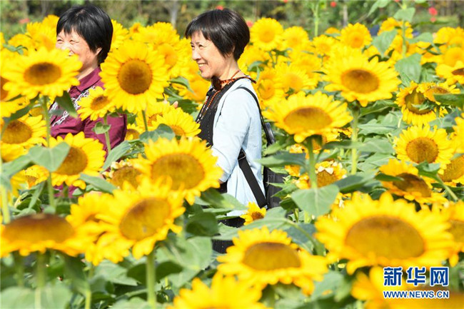 10月10日,游客在湖南省森林植物園的向日葵花海中漫步賞花。新華社記者 陳澤國(guó) 攝