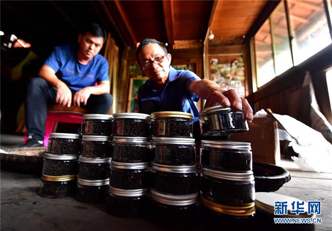 在黔桂烏英苗寨,村民在包裝當?shù)匾吧纳缴n子(10月10日攝)。