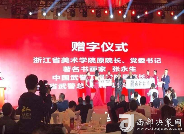 浙江省美術(shù)學(xué)院原院長(zhǎng)、黨委書(shū)記、著名書(shū)畫(huà)家——張永生,浙江省武警總隊(duì)原總隊(duì)長(zhǎng)何虎少將現(xiàn)場(chǎng)贈(zèng)字,西鳳股份公司副董事長(zhǎng)、總經(jīng)理賈智勇上臺(tái)接受贈(zèng)字。