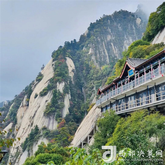 整個(gè)西峰為一塊渾然天成的巨石,北面臨空,懸崖絕壁如刀削鋸截,東西兩側(cè)狀如蓮花,因此也稱“蓮花峰”,這里更是“劈山救母”、“寶蓮燈”等傳說故事的發(fā)生地。